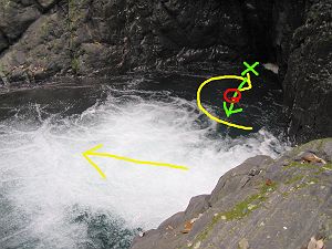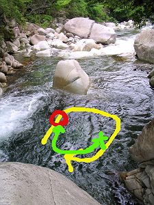 釣り座を下方に移動し下の写真×印に投入し、仕掛けを沈めながら手前へ引いて来、流れに当たりだしたところで流し始め、後方へ竿を倒しながら竿と糸が一直線に近くなるまで流します。これ以上は流せないギリギリの辺り(仕掛けは止まりかけている)で二尾釣れました。